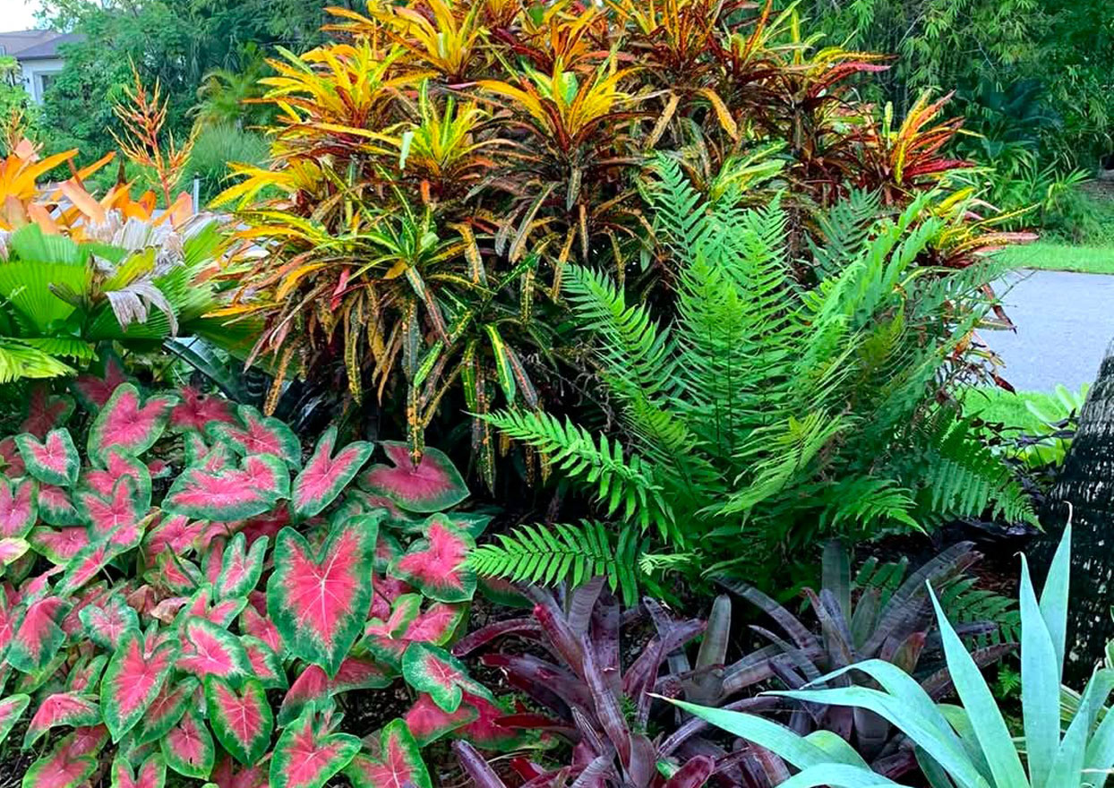 Caladiums, zanzibar croton, red and odorata bromeliads | Love's Landscape Landscape Installation & Maintenance Company