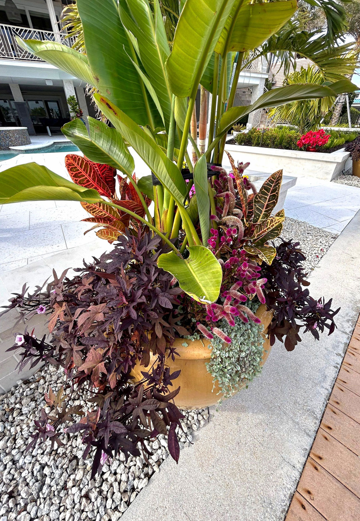 Wind resistant Fiddle Leaf Fig, trailing vinca, English ivy and croton for full time color | Love's Landscape Landscape Installation & Maintenance Company